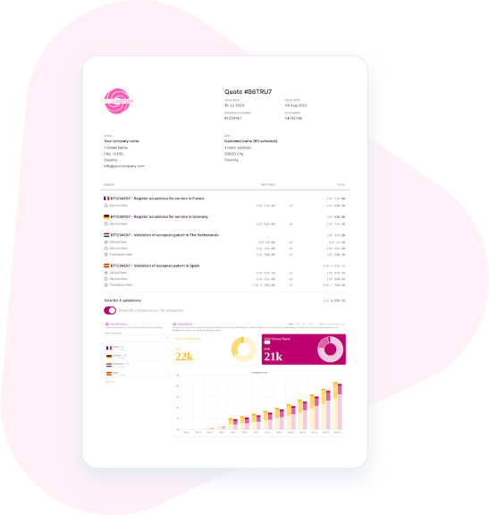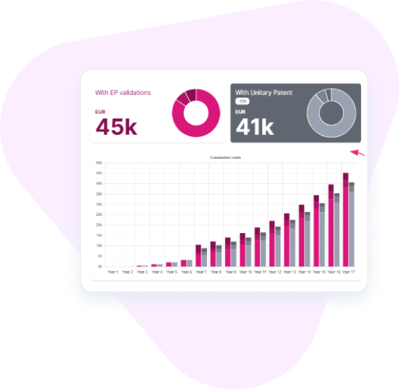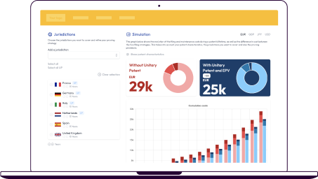 Your clients can run dynamic cost simulations using your firm’s actual fees for unitary effect, traditional validations and annuities, as well as adjust jurisdiction parameters to instantly visualise lifetime patent cost impacts